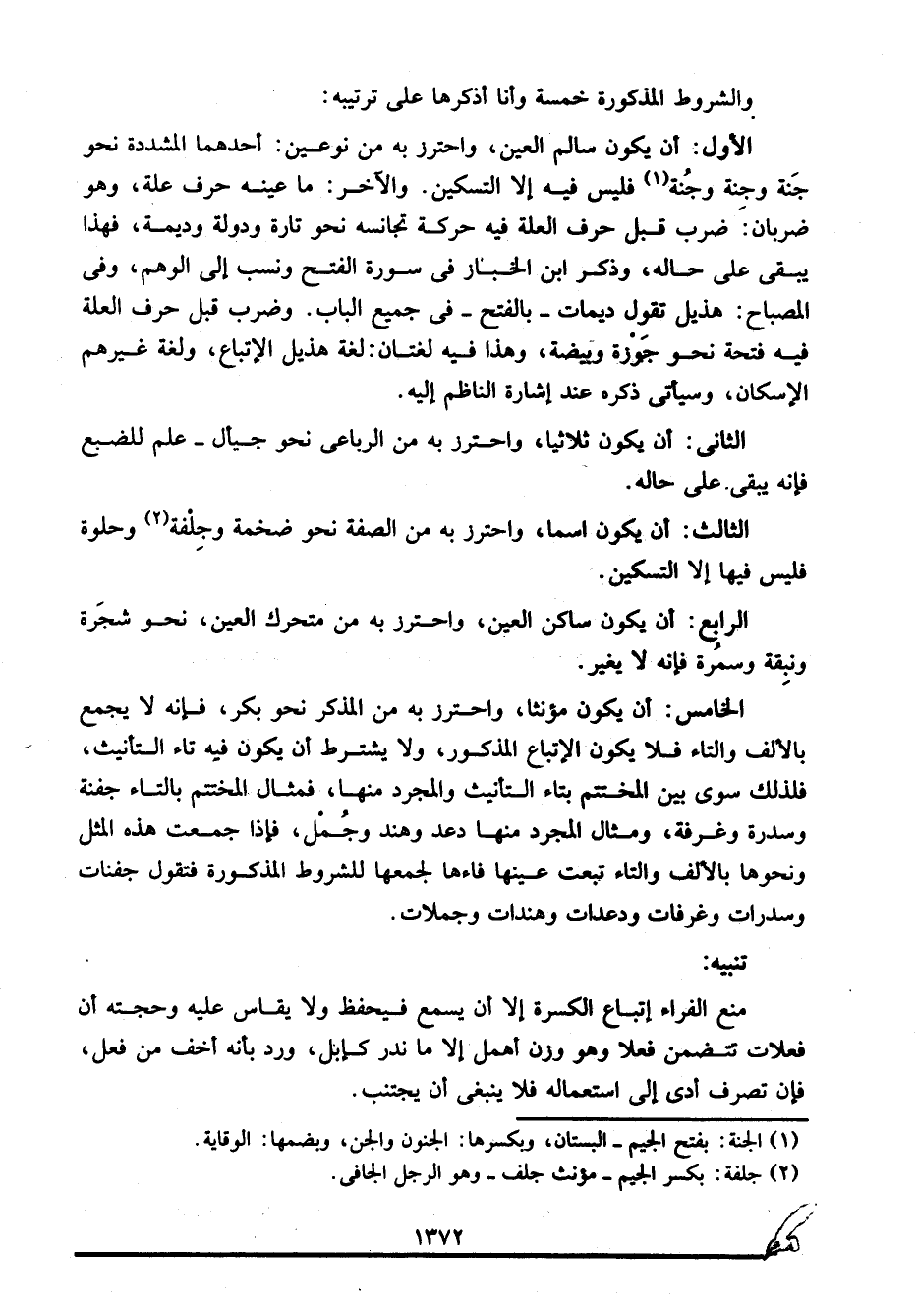 الخامس: أن يكون مؤنثا، واحترز به من المذكر نحو بكر، فإنه لا يجمع بالألف والتاء فلا يكون الإتباع المذكور، ولا يشترط أن يكون فيه تاء التأنيث، فلذلك سوى بين المختتم بتاء التأنيث والمجرد منها، فمثال المختتم بالتاء جفنة وسدرة وغرفة، ومثال المجرد منها دعد وهند وجُمْل، فإذا جمعت هذه المثل ونحوها بالألف والتاء تبعت عينها فاءها لجمعها للشروط المذكورة فتقول: جفنات وسدرات وغرفات ودعدات وهندات وجملات.