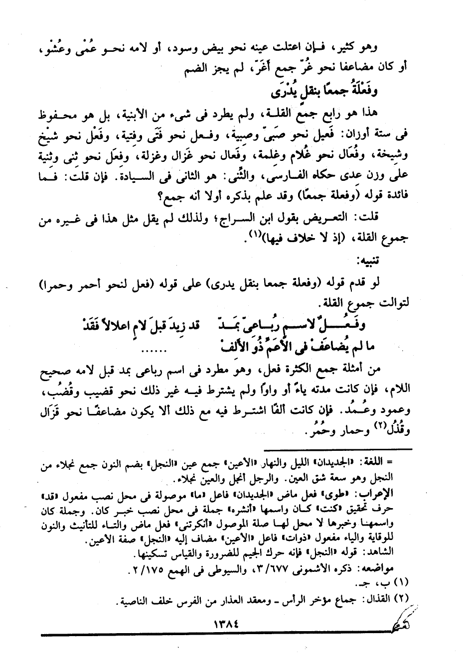 من أمثلة جمع الكثرة فعل، وهو مطرد في اسم رباعي بمد قبل لامه صحيح اللام، فإن كانت مدته ياء أو واوا ولم يشترط فيه غير ذلك نحو: قضيب وقُضُب، وعمود وعُمُد. فإن كانت ألفا اشترط فيه مع ذلك ألا يكون مضاعفا نحو: قَزَال وقُذُل2 وحِمَار وحُمُر.
