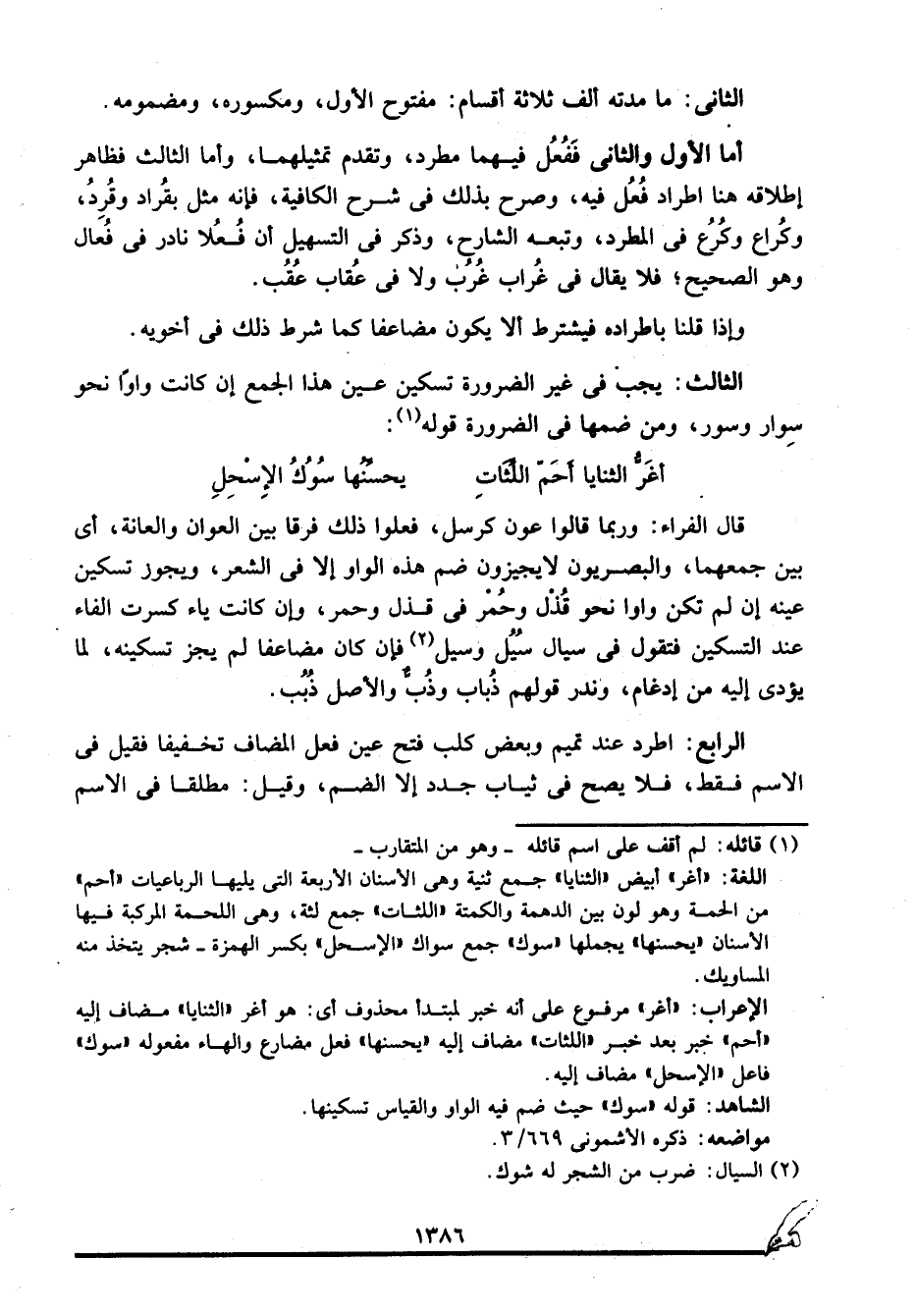الثالث: يجب في غير الضرورة تسكين عين هذا الجمع إن كانت واوا نحو: سِوار وسور، ومن ضمها في الضرورة قوله1: