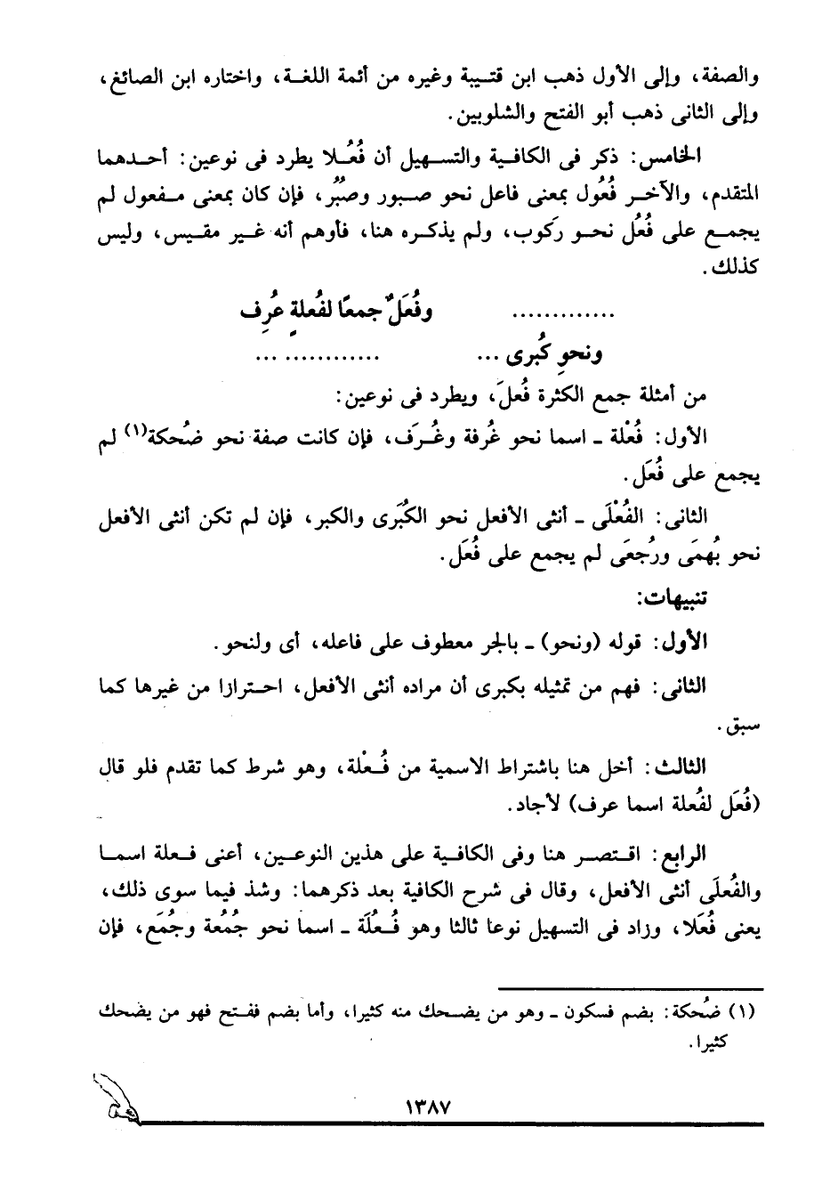 الرابع: اقتصر هنا وفي الكافية على هذين النوعين، أعني فعلة اسما والفُعلَى أثنى الأفعل، وقال في شرح الكافية بعد ذكرهما: وشذ فيما سوى ذلك، يعني فُعَلا، وزاد في التسهيل نوعا ثالثا وهو فُعُلَة اسما نحو: جُمُعة وجُمَع، فإن