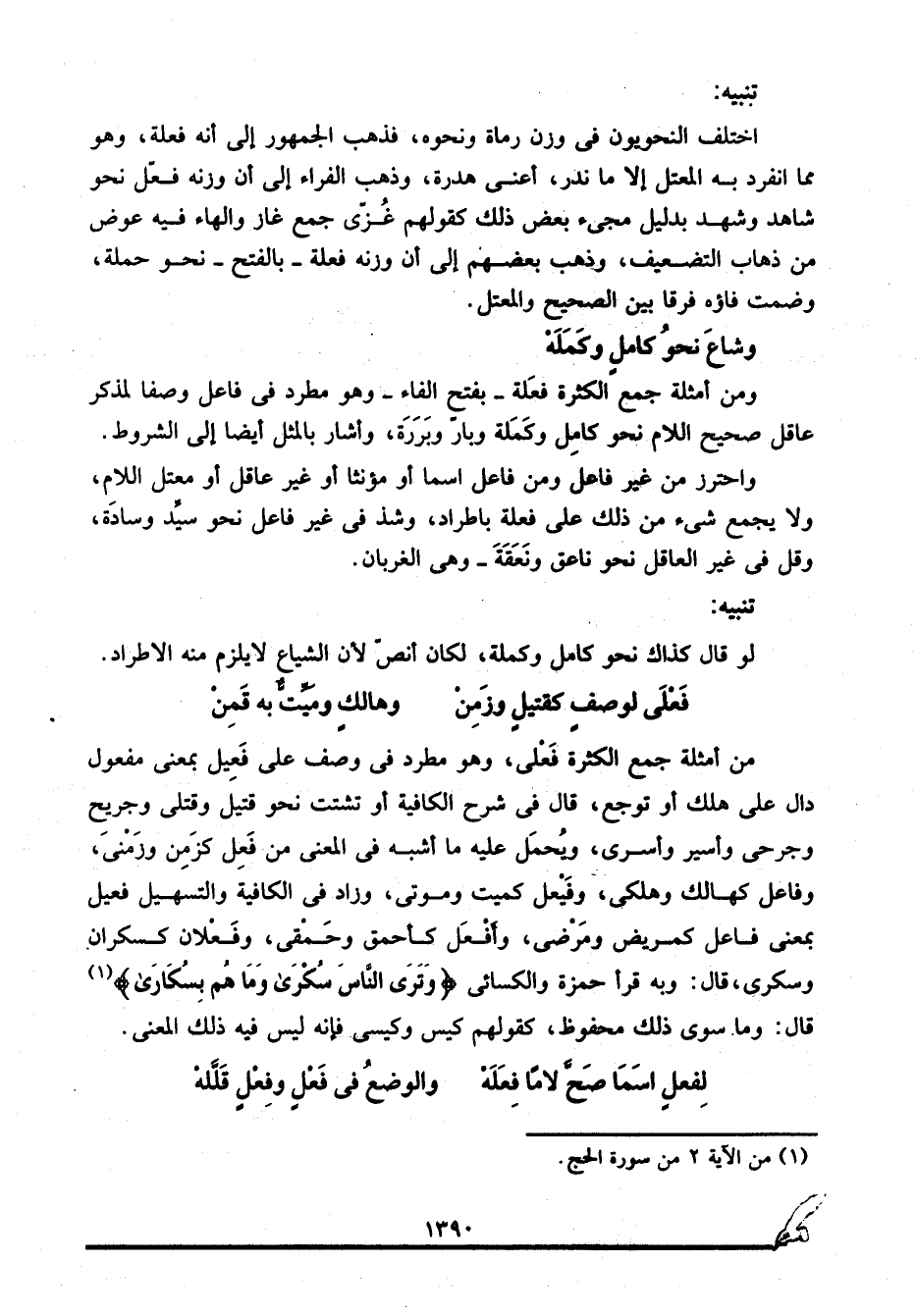 ومن أمثلة جمع الكثرة فعلة -بفتح الفاء- وهو مطرد في فاعل وصفا لمذكر عاقل صحيح اللام نحو: كامِل وكَمَلة وبارّ وبَرَرَة، وأشار بالمثل أيضا إلى الشروط.