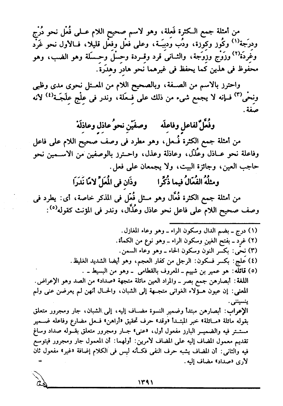 من أمثلة جمع الكثرة فُعَّل، وهو مطرد في وصف صحيح اللام على فاعل وفاعلة نحو: عاذل وعذل، وعاذلة وعذل، واحترز بالوصفين من الاسمين نحو: حاجب العين، وجائزة البيت، ولا يجمعان على فعل.
