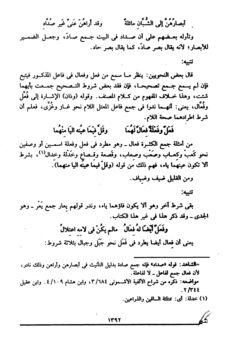 من أمثلة جمع الكثرة فِعَال، وهو مطرد في فعل وفعلة اسمين أو وصفين نحو: كعب وكعاب، وصعب وصعاب، وقصعة وقصاع، وخَدْلة وخدال1، بشرط ألا تكون عينهما ياء، فهم ذلك من قوله: "وقل فيما عينه اليا منهما".