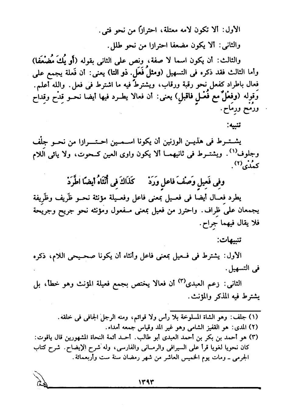 الأول: يشترط في فعيل بمعنى فاعل وأنثاه أن يكونا صحيحي اللام، ذكره في التسهيل.