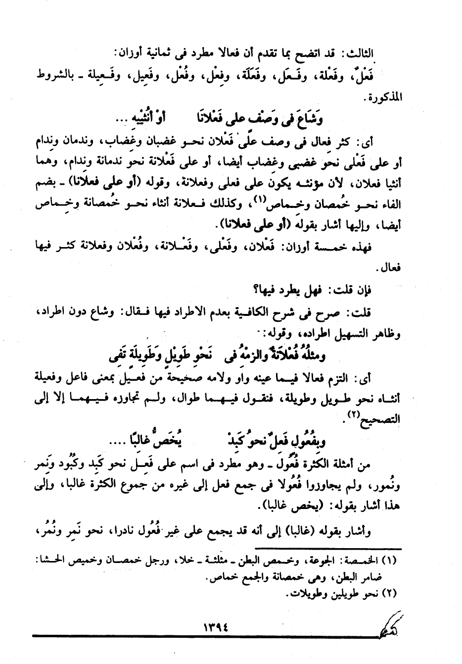 من أمثلة الكثرة فُعُول، وهو مطرد في اسم على فَعِل نحو: كبد وكُبُود ونمر ونُمُور، ولم يجاوزوا فُعُولا في جمع فعل إلى غيره من جموع الكثرة غالبا، وإلى هذا أشار بقوله: "يخص غالبا".