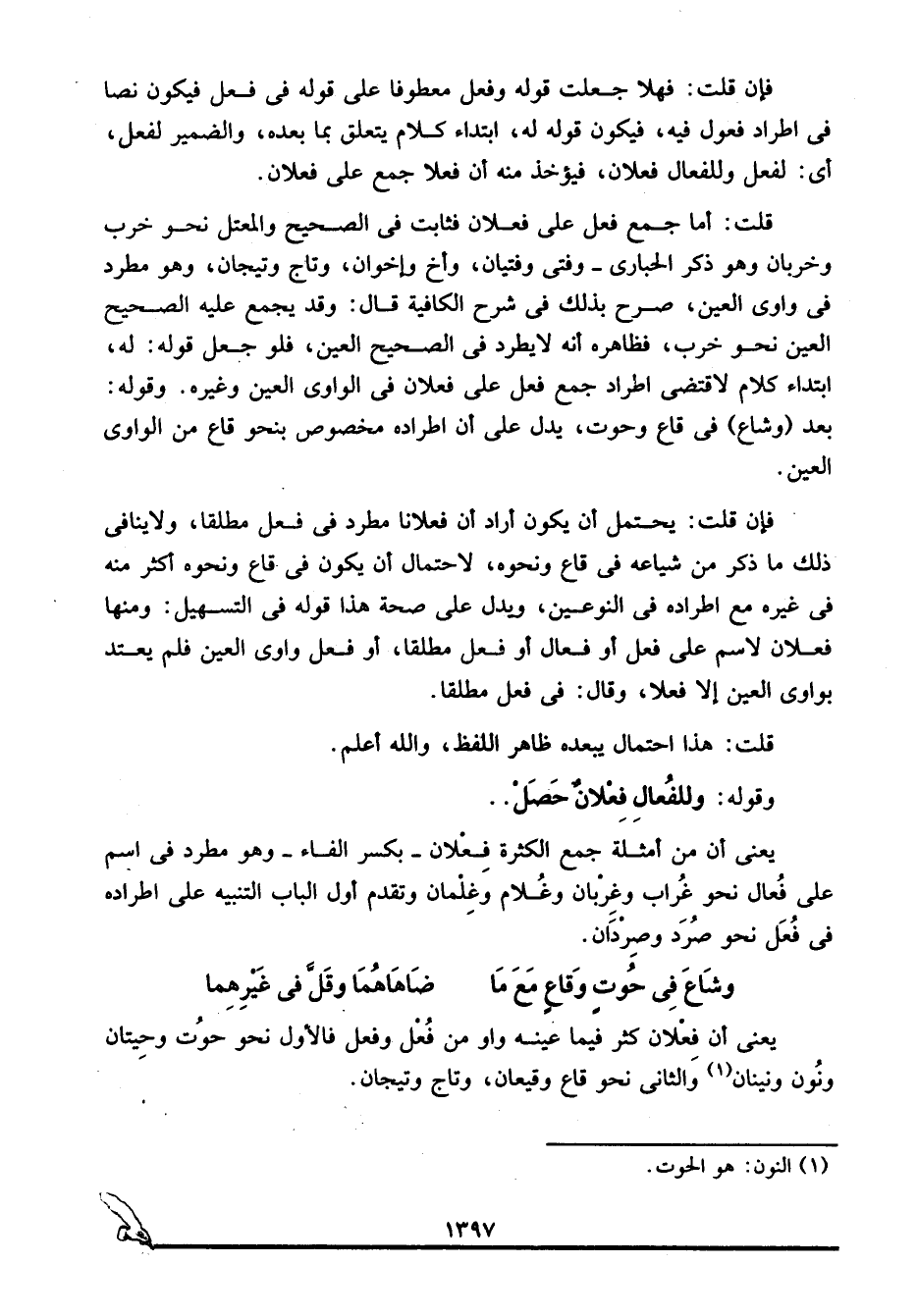 فإن قلت: يحتمل أن يكون أراد أن فعلانا مطرد في فعل مطلقا، ولا ينافي ذلك ما ذكر من شياعه في قاع ونحوه، لاحتمال أن يكون في قاع ونحوه أكثر منه في غيره مع اطراده في النوعين، ويدل على صحة هذا قوله في التسهيل: ومنها فعلان لاسم على فعل أو فعال أو فعل مطلقا، أو فعل واوي العين فلم يعتد بواوي العين إلا فعلا، وقال: في فعل مطلقا.