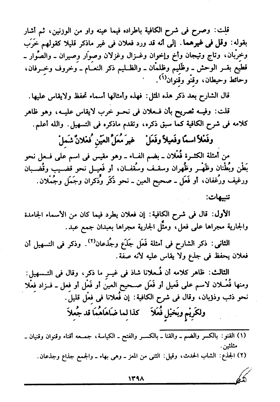 الثاني: ذكر الشارح في أمثلة فَعَل جَذَع وجُذعان2. وذكر في التسهيل أن فعلان يحفظ في جذع ولا يقاس عليه لأنه صفة.