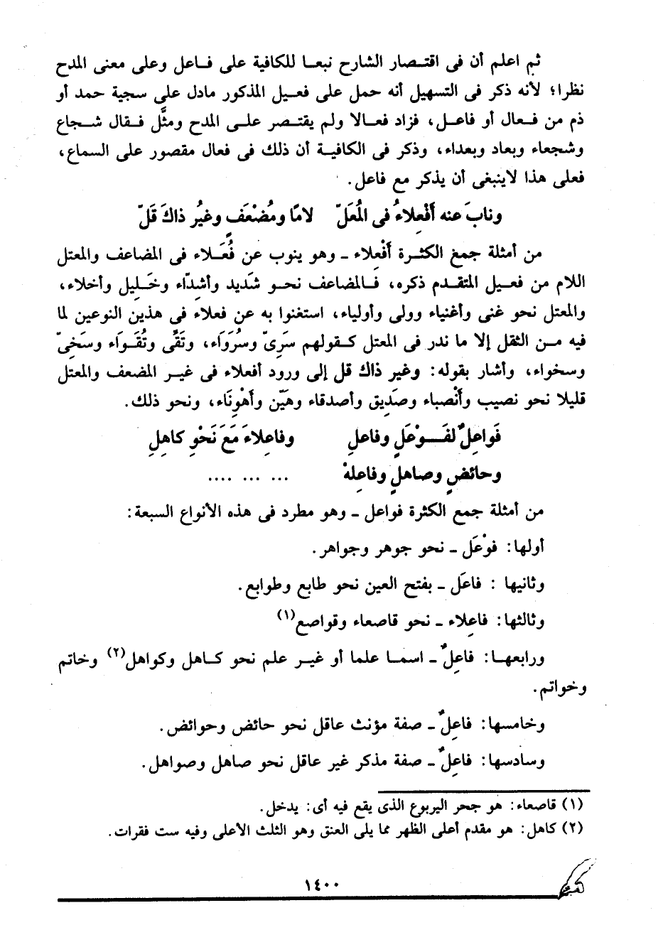 من أمثلة جمع الكثرة أَفْعِلاء، وهو ينوب عن فُعَلاء في المضاعف والمعتل اللام من فعيل المتقدم ذكره، فالمضاعف نحو: شديد وأشداء وخليل وأخلاء، والمعتل نحو: غني وأغنياء وولي وأولياء، استغنوا به عن فعلاء في هذين النوعين لما فيه من الثقل إلا ما ندر في المعتل كقولهم: سَرِيّ وسُرَوَاء، وتقي وتُقَواء، وسَخِي وسخواء، وأشار بقوله: وغير ذاك قل، إلى ورود أفعلاء في غير المضعف والمعتل قليلا نحو: نصيب وأنصباء وصديق وأصدقاء وهَيِّن وأَهْوِنَاء، ونحو ذلك.