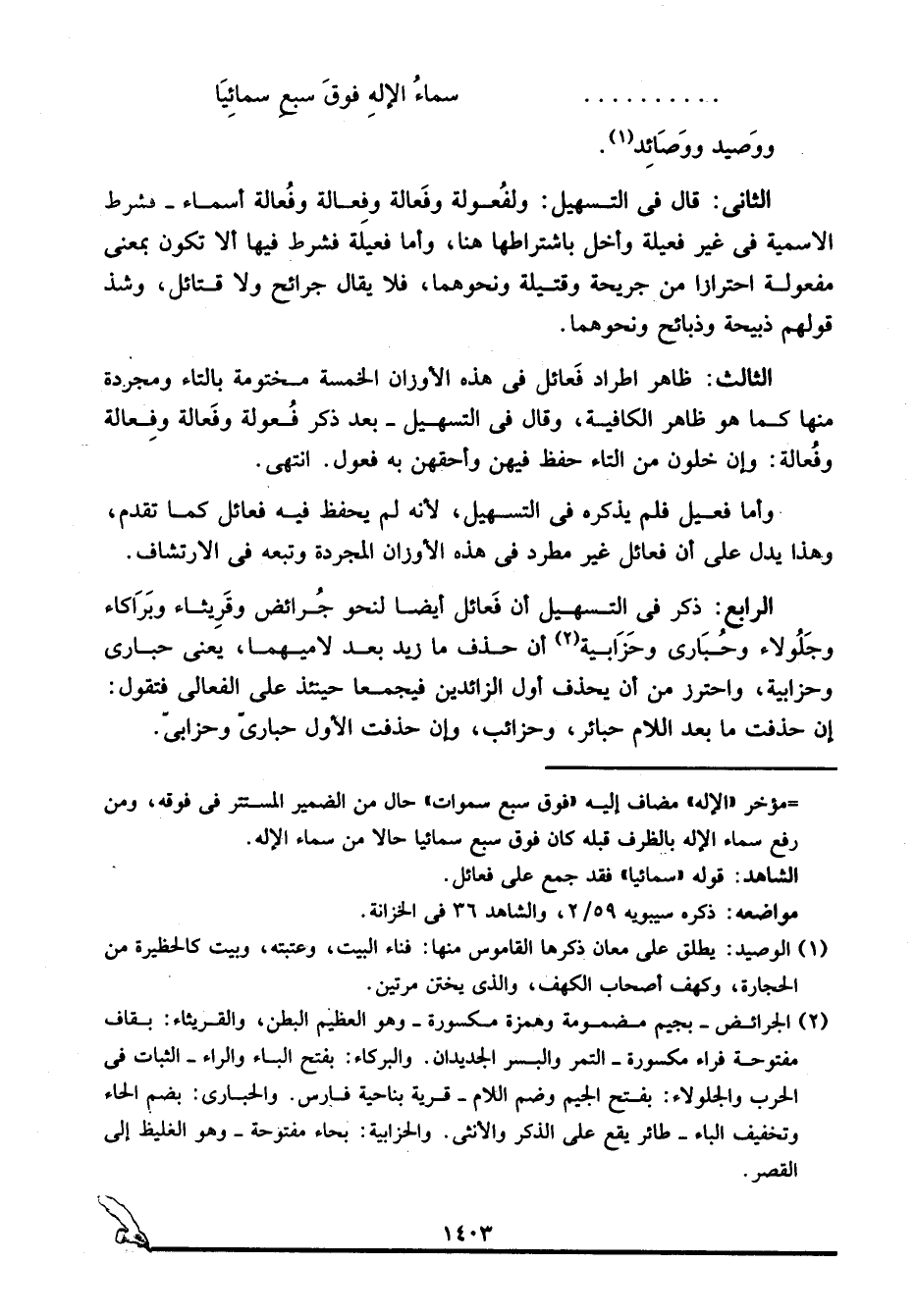 2 الجرائض -بجيم مضمومة وهمزة مكسورة- وهو العظيم البطن، والقريثاء -بقاف مفتوحة فراء مكسورة- التمر والبسر الجديدان، والبركاء -بفتح الباء والراء- الثبات في الحرب، والجلولاء -بفتح الجيم وضم اللام- قرية بناحية فارس، الحبارى -بضم الحاء وتخفيف الباء- طائر يقع على الذكر والأنثى، والحزابية -بحاء مفتوحة- هو الغليظ إلى القصر.