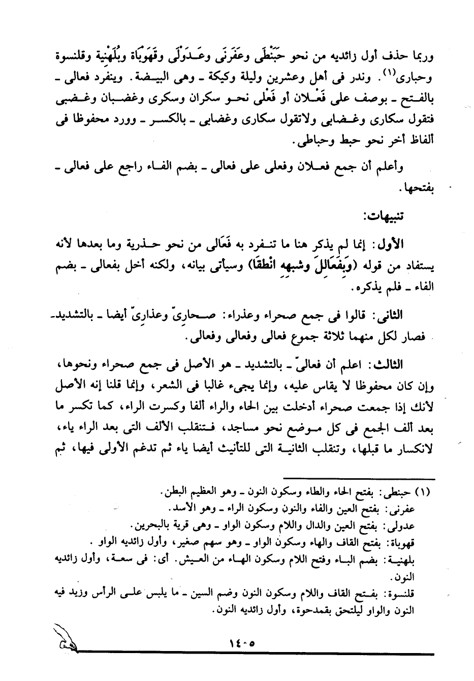 وربما حذف أول زائديه من نحو: حَبَنْطَى وعَفَرنَى وعَدَوْلَى وقَهَوْبَاة وبُلَهْنِية وقلنسوة وحبارى1. وندر في أهل وعشرين وليلة وكيكة، وهي البيضة. وينفرد فعالَى -بالفتح- بوصف على فَعْلان أو فَعْلى نحو: سكران وسكرى وغضبان وغضبى فتقول: سكارى وغضابى، ولا تقول: سكاري وغضابي -بالكسر- وورد محفوظا في ألفاظ أخر نحو: حبط وحباطى.