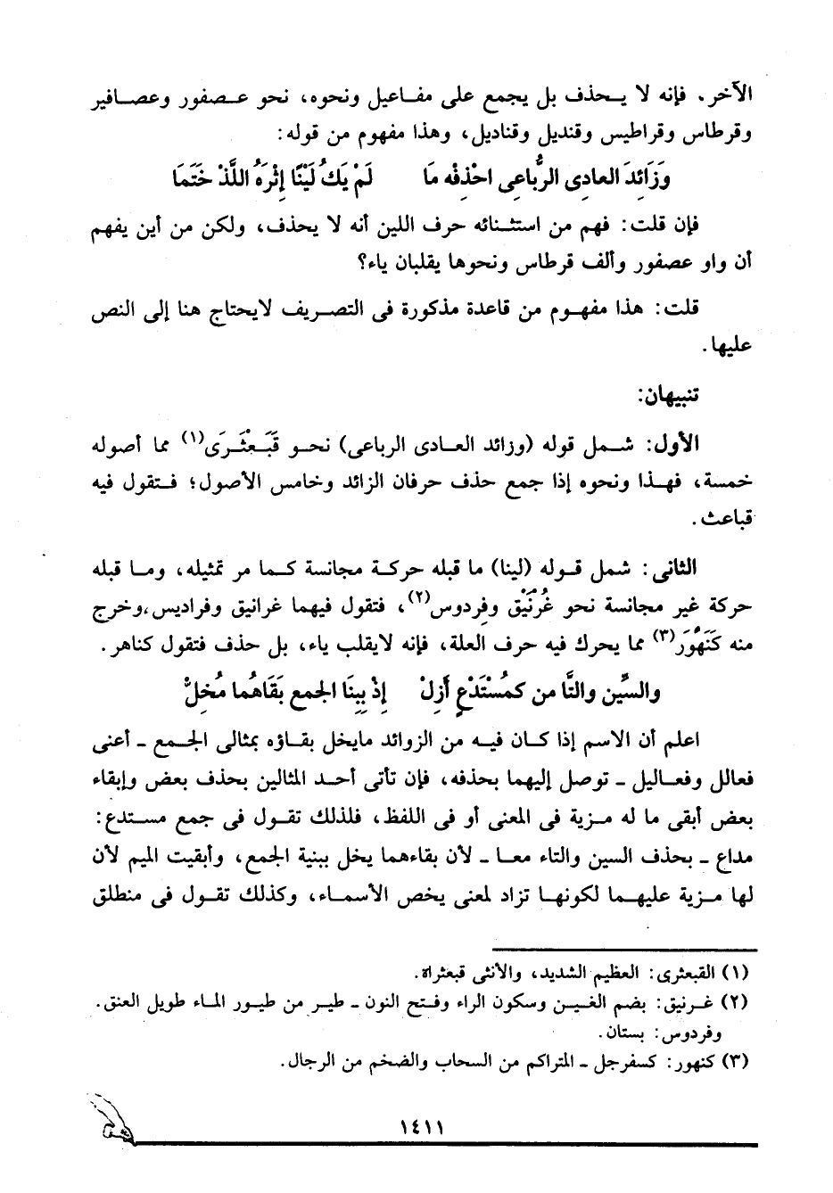 الثاني: شمل قوله: "لينا" ما قبله حركة مجانسة كما مر تمثيله، وما قبله حركة غير مجانسة نحو: غُرْنَيْق وفردوس2، فتقول فيهما: غرانيق وفراديس، وخرج منه كَنَهْوَر3 مما يحرك فيه حرف العلة، فإنه لا يقلب ياء، بل حذف فتقول: كناهر.