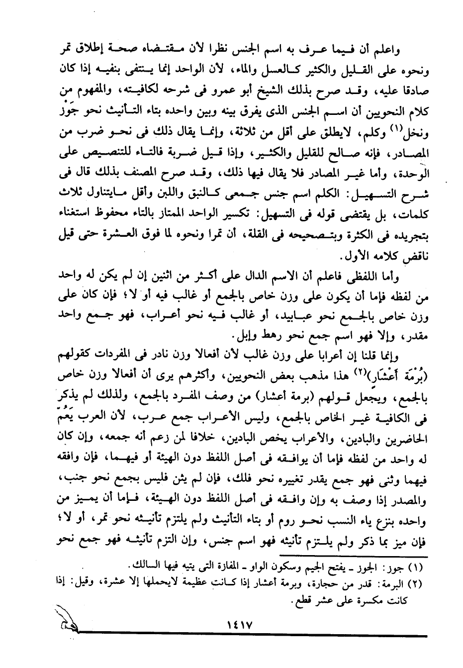وإنما قلنا: إن أعرابا على وزن غالب؛ لأن أفعالا وزن نادر في المفردات كقولهم: "برمة أعشار"2 هذا مذهب بعض النحويين، وأكثرهم يرى أن أفعالا وزن خاص بالجمع، ويجعل قولهم: "برمة أعشار" من وصف المفرد بالجمع، ولذلك لم يذكر في الكافية غير الخاص بالجمع، وليس الأعراب جمع عرب؛ لأن العرب يعم الحاضرين والبادين، والأعراب يخص البادين، خلافا لمن زعم أنه جمعه، وإن كان له واحد من لفظه فإما أن يوافقه في أصل اللفظ دون الهيئة أو فيهما، فإن وافقه فيهما وثنى فهو جمع يقدر تغييره نحو فلك، فإن لم يثن فليس بجمع نحو جنب، والمصدر إذا وصف به وإن وافقه في أصل اللفظ دون الهيئة، فإما أن يميز من واحده بنزع ياء النسب نحو روم أو بتاء التأنيث ولم يلتزم تأنيثه نحو تمر أو لا، فإن ميز بما ذكر ولم يلتزم تأنيثه فهو اسم جنس، وإن التزم تأنيثه فهو جمع نحو