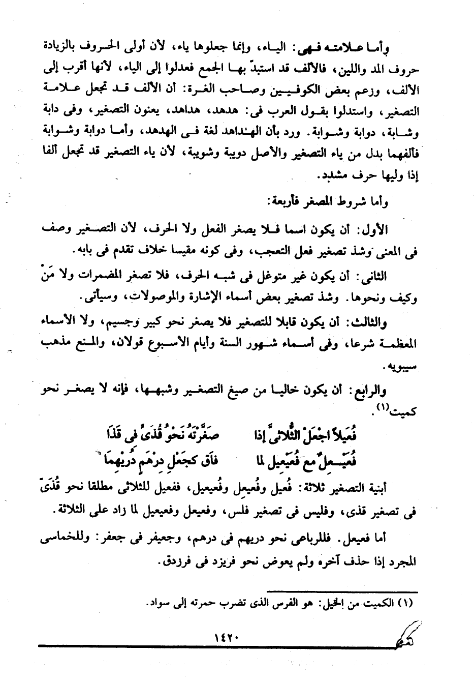الأول: أن يكون اسما فلا يصغر الفعل ولا الحرف؛ لأن التصغير وصف في المعنى وشذ تصغير فعل التعجب، وفي كونه مقيسا خلاف تقدم في بابه.