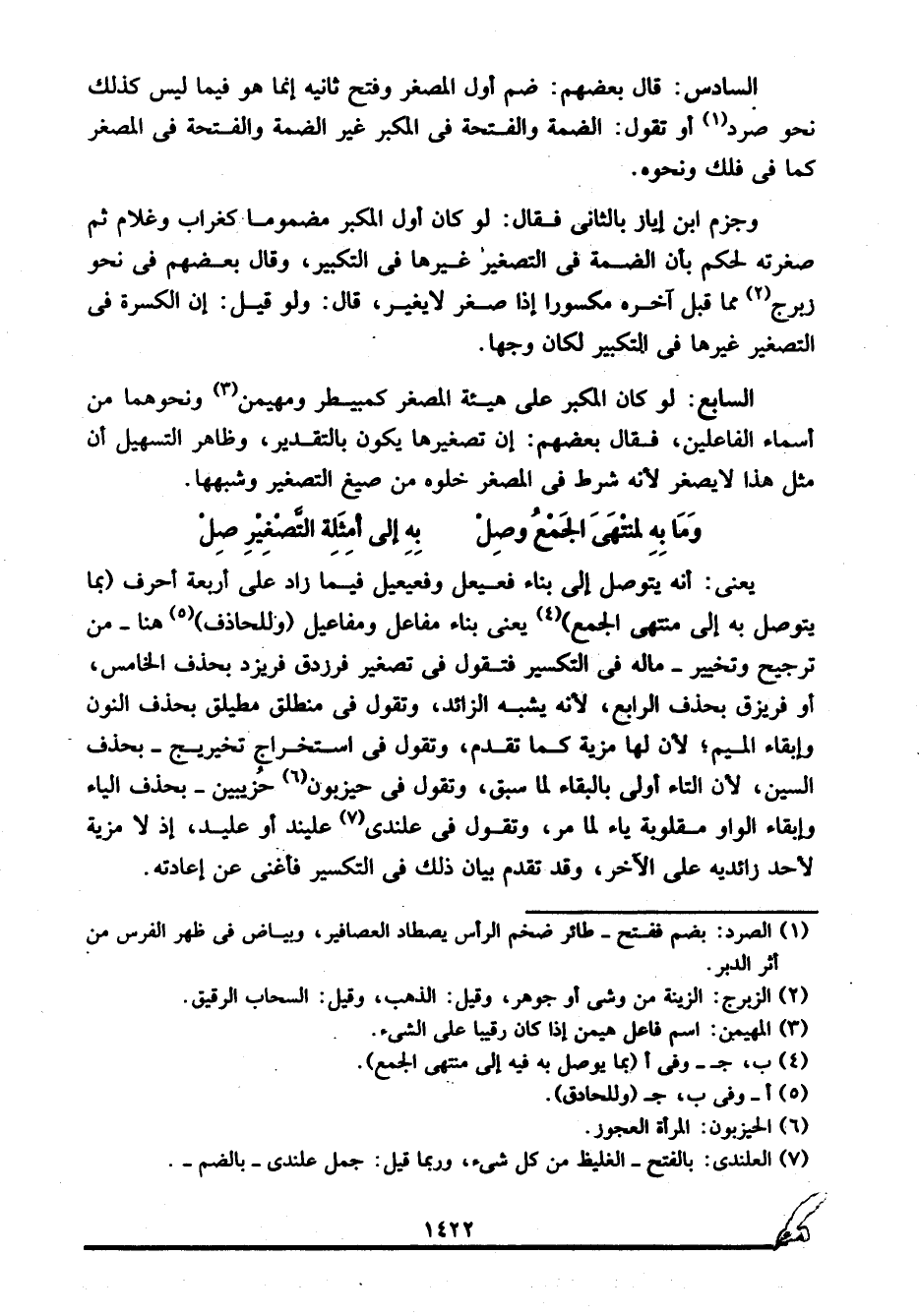 السابع: لو كان المكبر على هيئة المصغر كمبيطر ومهيمن3 ونحوهما من أسماء الفاعلين، فقال بعضهم: إن تصغيرها يكون بالتقدير، وظاهر التسهيل أن مثل هذا لا يصغر؛ لأنه شرط في المصغر خلوه من صيغ التصغير وشبهها.