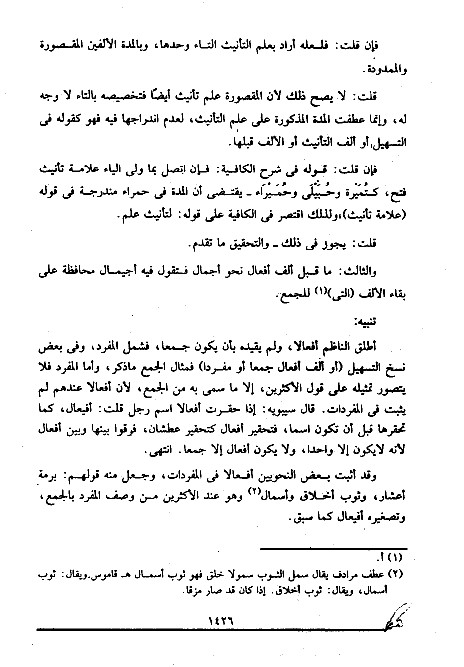 وقد أثبت بعض النحويين أفعالا في المفردات، وجعل منه قولهم: برمة أعشار، وثوب أخلاق وأسمال2، وهو عند الأكثرين من وصف المفرد بالجمع، وتصغيره أفيعال كما سبق.