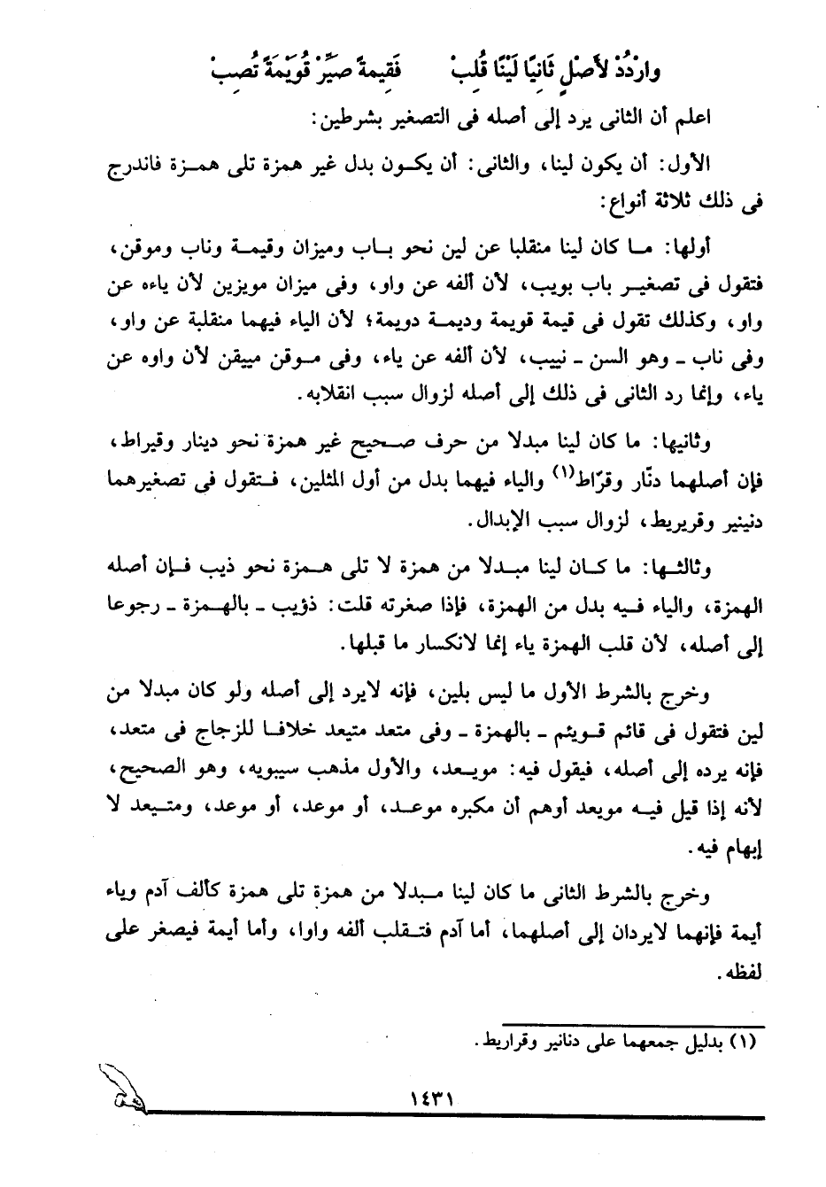 وثانيها: ما كان لينا مبدلا من حرف صحيح غير همزة نحو: دينار وقيراط، فإن أصلهما دنار وقراط1 والياء فيهما بدل من أول المثلين، فتقول في تصغيرهما: دنينير وقريريط؛ لزوال سبب الإبدال.