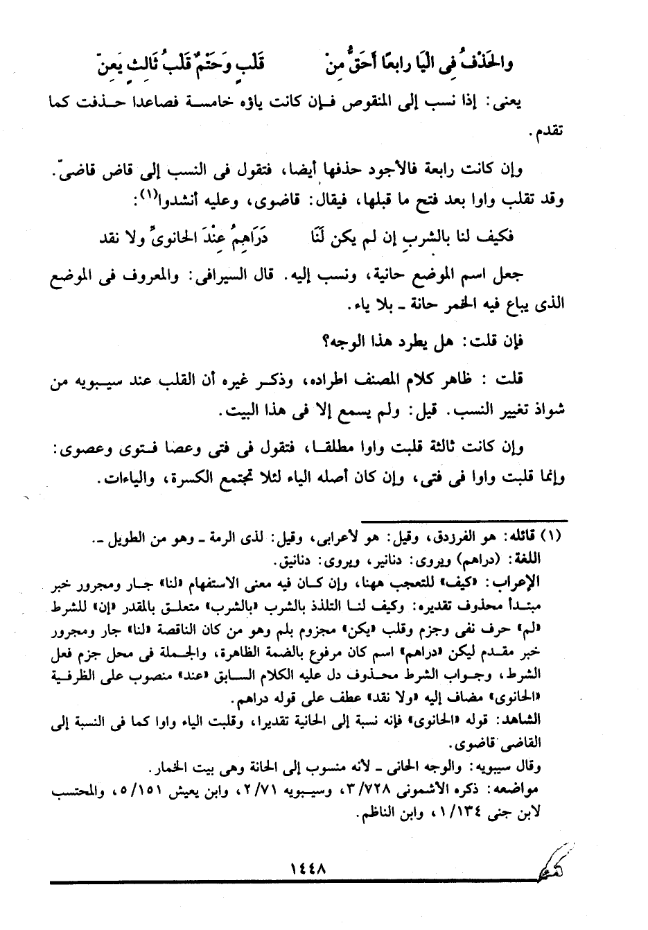 الشاهد: قوله: "الحانوي" فإنه نسبه إلى الحانية تقديرا، وقلبت الياء واوا كما في النسبة إلى القاضي قاضوي.