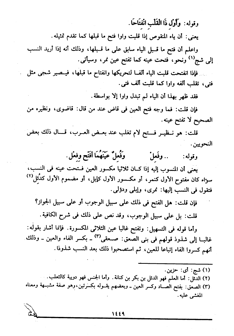 وأما قوله في التسهيل: وتفتح غالبا عين الثلاثي المكسورة. فإنما أشار بقوله: غالبا إلى شذوذ قولهم في بنى الصعق: صعقي3 -بكسر الفاء والعين- وذلك أنهم كسروا الفاء إتباعا للعين، ثم استصحبوا ذلك بعد النسب شذوذا.