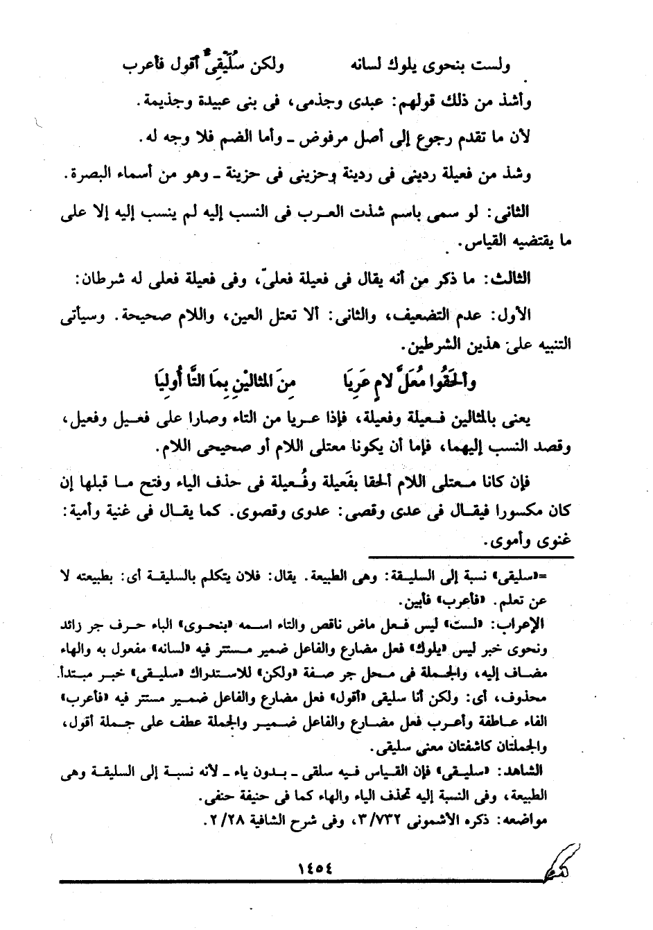 الشاهد: "سليقي" فإن القياس فيه سلقي -بدون ياء- لأنه نسبة إلى السليقة وهي الطبيعة، وفي النسبة إليه تحذف الياء والهاء كما في حنيفة حنفي.