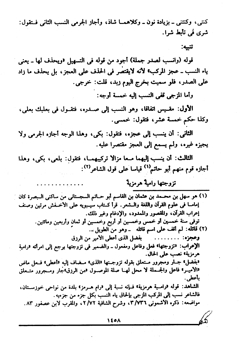 الشاهد: قوله: "رامية هرمزية" فإنه نسبة إلى "رام هرمز" بلدة من نواحي خوزستان، فالشاعر نسب إلى المركب المزجي بإلحاق ياء النسب بكل جزء من جزأيه.