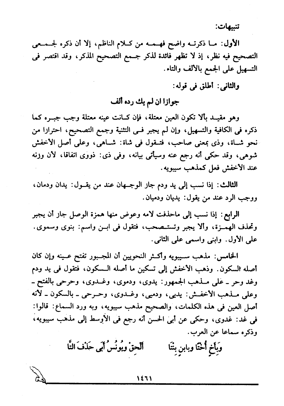 الخامس: مذهب سيبويه وأكثر النحويين أن المجبور تفتح عينه وإن كان أصله السكون. وذهب الأخفش إلى تسكين ما أصله السكون، فتقول في يد ودم وغد وحر -على مذهب الجمهور: يدوي، ودموي، وغدوي، وحرحي بالفتح، وعلى مذهب الأخفش: يدي، ودميي، وغدوي، وحرحي -بالسكون- لأنه أصل العين في هذه الكلمات، والصحيح مذهب سيبويه، وبه ورد السماع قالوا في غد: غدوي، وحكي عن أبي الحسن أنه رجع في الأوسط إلى مذهب سيبويه، وذكره سماعا عن العرب.