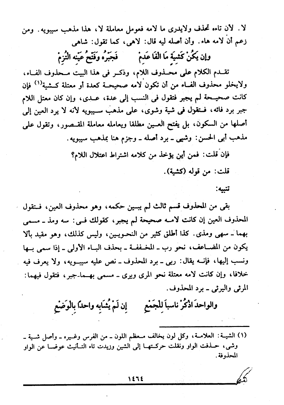 تقدم الكلام على محذوف اللام، وذكر في هذا البيت محذوف الفاء، ولا يخلو محذوف الفاء من أن تكون لامه صحيحة كعدة أو معتلة كشية1، فإن كانت صحيحة لم يجبر فتقول في النسب إلى عدة: عدي، وإن كان معتل اللام جبر برد فائه، فتقول في شية وشوي، على مذهب سيبويه؛ لأنه لا يرد العين إلى أصلها من السكون، بل يفتح العين مطلقا ويعامله معاملة المقصور، وتقول على مذهب أبي الحسن: وشيي -برد أصله- وجزم هنا بمذهب سيبويه.