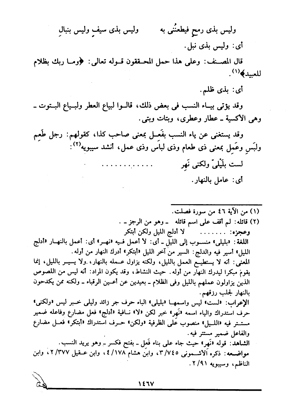 وقد يستغنى عن ياء النسب بفَعِل بمعنى صاحب كذا، كقولهم: رجل طَعِم ولَبِس وعَمِل بمعنى ذي طعام وذي لباس وذي عمل، أنشد سيبويه2: