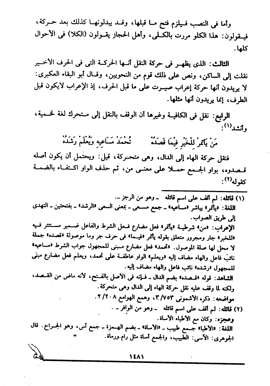 الشاهد: قوله: "قصده" بضم الدال فإنه في الأصل بالفتح؛ لأنه ماض من القصد، ولكنه لما وقف عليه نقل حركة الهاء إلى الدال وهي متحركة.