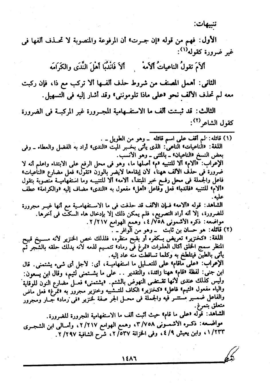 الشاهد: قوله: "ألامه" فإن الألف قد حذفت في ما الاستفهامية مع أنها غير مجرورة للضرورة، إلا أنه أراد التصريع، فلم يمكن ذلك إلا بإدخال هاء السكت في آخرها.