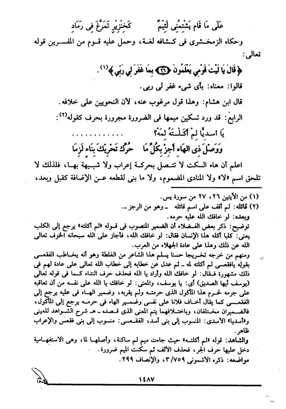 والشاهد: قوله: "لم أكلته" حيث جاءت ميم لم ساكنة، وأصلها لما، وهي الاستفهامية دخل عليها حرف الجر، فحذف الألف ثم سكنت الميم ضرورة.