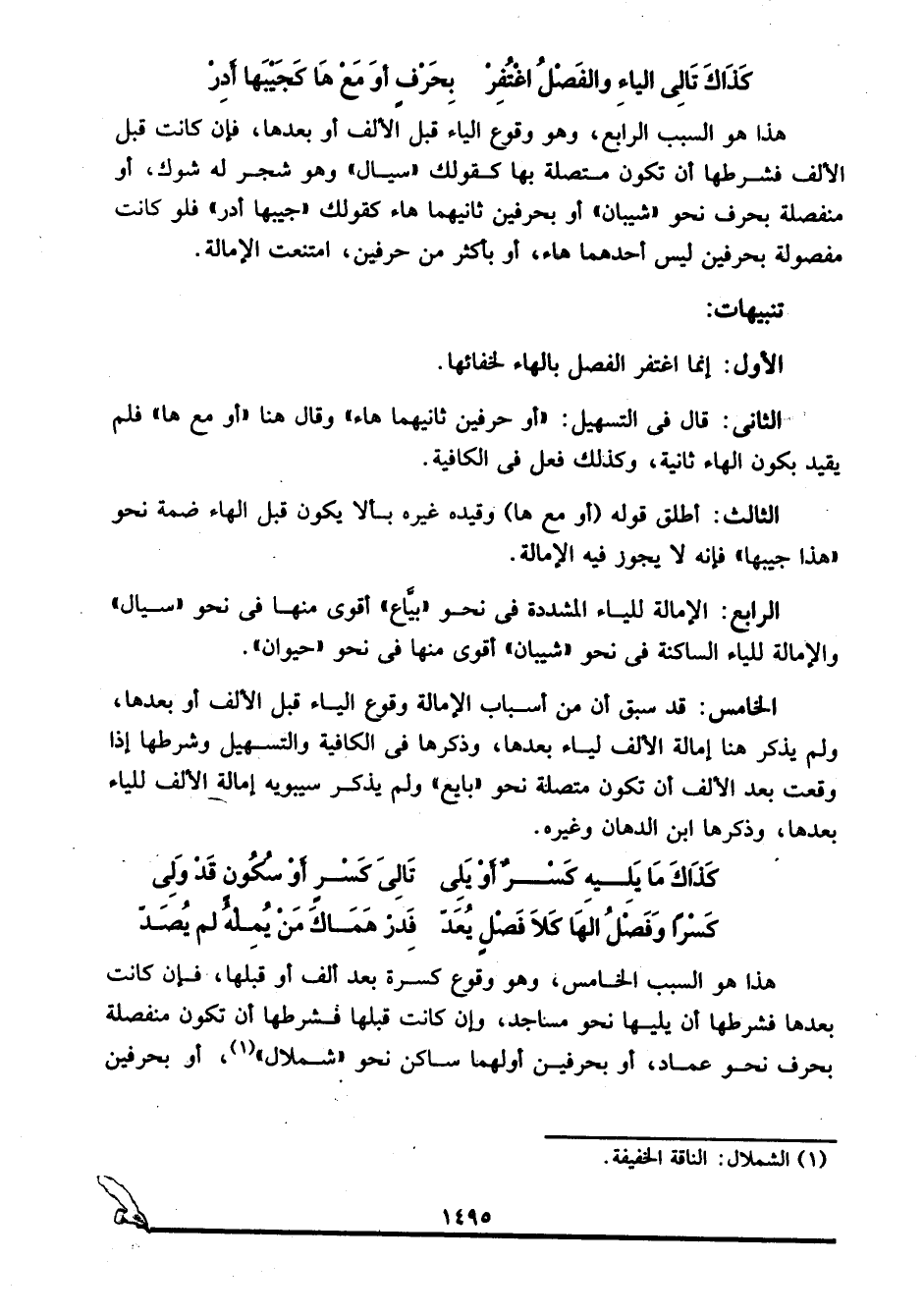 الخامس: قد سبق أن من أسباب الإمالة وقوع الياء قبل الألف أو بعدها، ولم يذكر هنا إمالة الألف لياء بعدها، وذكرها في الكافية والتسهيل وشرطها إذا وقعت بعد الألف أن تكون متصلة نحو "بايع" ولم يذكر سيبويه إمالة الألف للياء بعدها، وذكرها ابن الدهان وغيره.