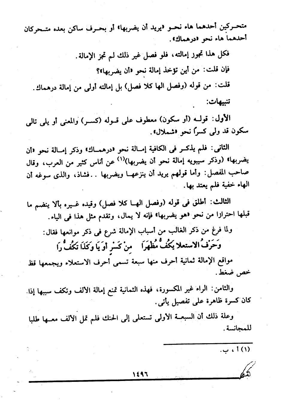 الثاني: فلم يذكر في الكافية إمالة نحو "درهماك" وذكر إمالة نحو "أن يضربها" "وذكر سيبويه إمالة نحو أن يضربها"1 عن أناس كثير من العرب، وقال صاحب المفصل: وأما قولهم يريد أن ينزعها ويضربها، فشاذ، والذي سوغه أن الهاء خفية فلم يعتد بها.