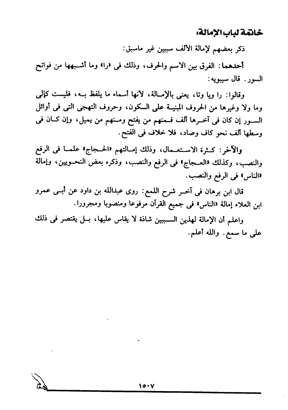 والآخر: كثرة الاستعمال، وذلك إمالتهم "الحجاج" علما في الرفع والنصب، وكذلك "العجاج" في الرفع والنصب، وذكره بعض النحويين، وإمالة "الناس" في الرفع والنصب.
