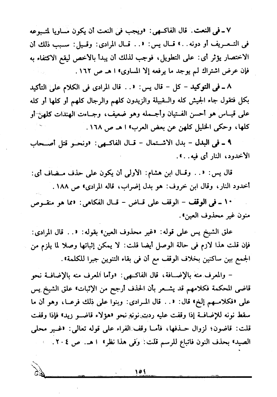 7- في النعت: قال الفاكهي: "ويجب في النعت أن يكون مساويا لمتبوعه في التعريف أو دونه ... ". قال يس: " ... قال المرادي: وقيل: سبب ذلك أن الاختصار يؤثر أي: على التطويل، فوجب لذلك أن يبدأ بالأخص ليقع الاكتفاء به فإن عرض اشتراك لم يوجد ما يرفعه إلا المساوي". ا. هـ. ص162.