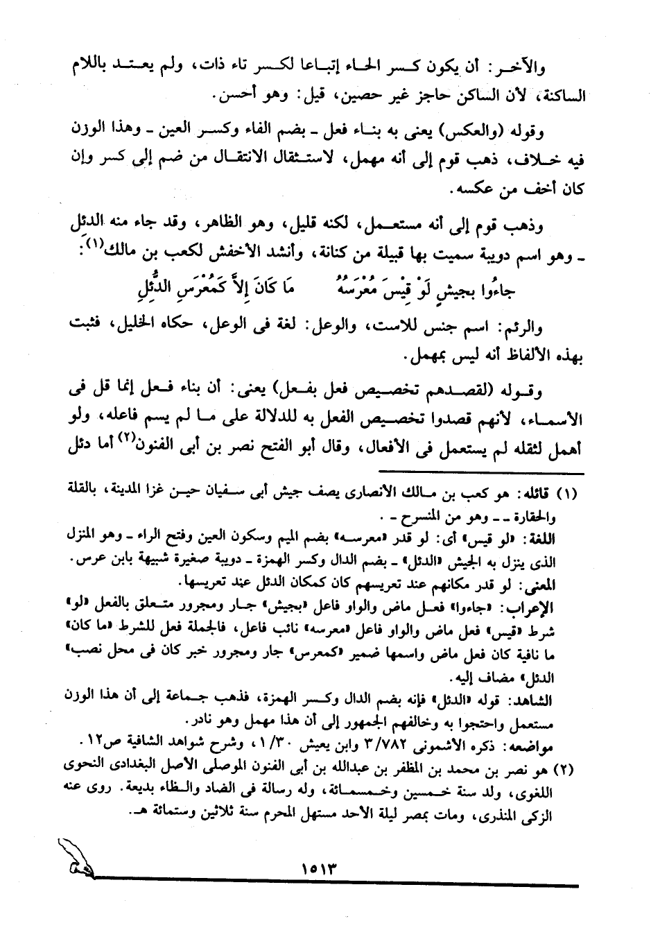 الشاهد: قوله: "الدئل" فإنه بضم الدال وكسر الهمزة، فذهب جماعة إلى أن هذا الوزن مستعمل واحتجوا به وخالفهم الجمهور إلى أن هذا مهمل وهو نادر.