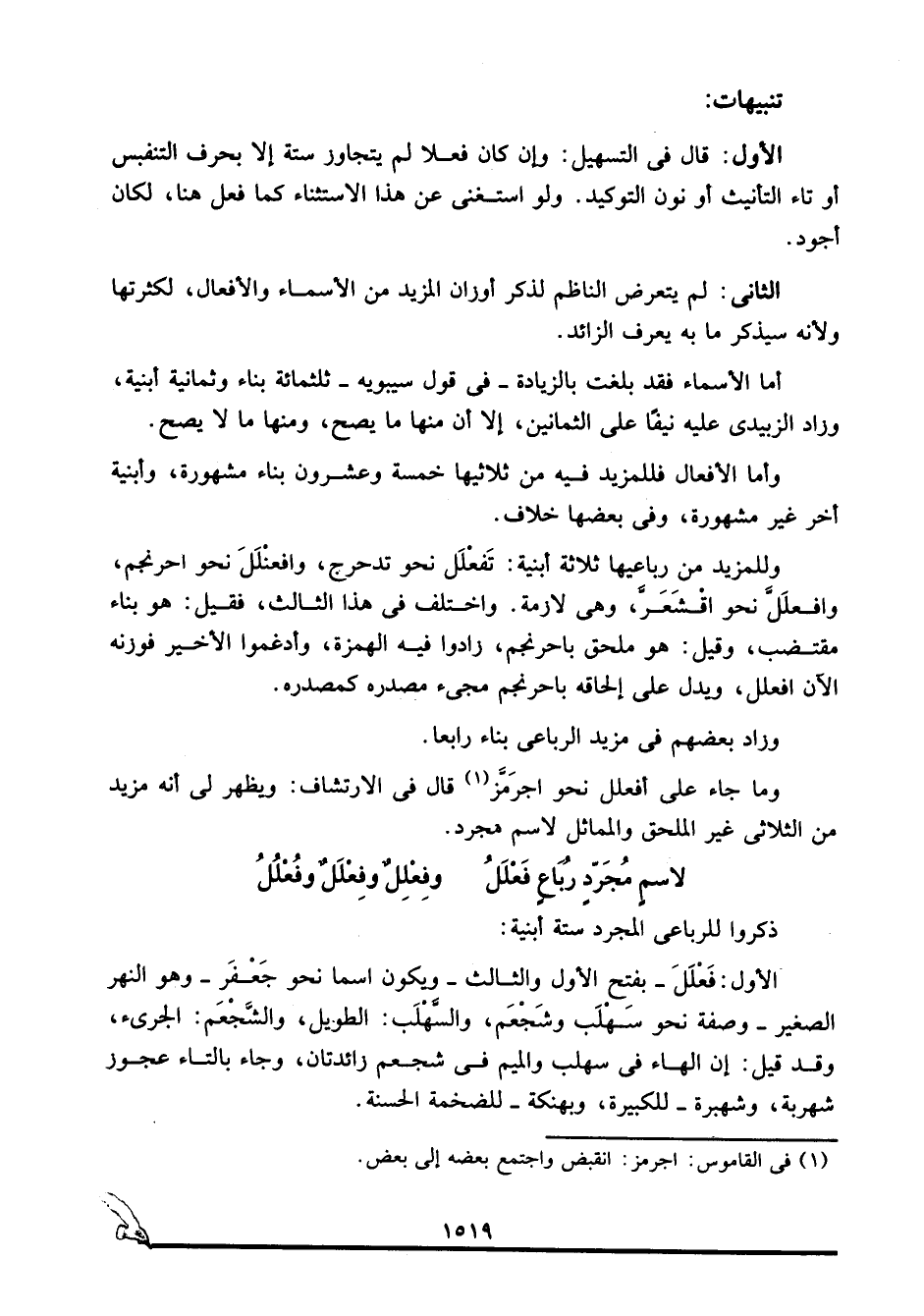 الثاني: لم يتعرض الناظم لذكر أوزان المزيد من الأسماء والأفعال؛ لكثرتها ولأنه سيذكر ما به يعرف الزائد.