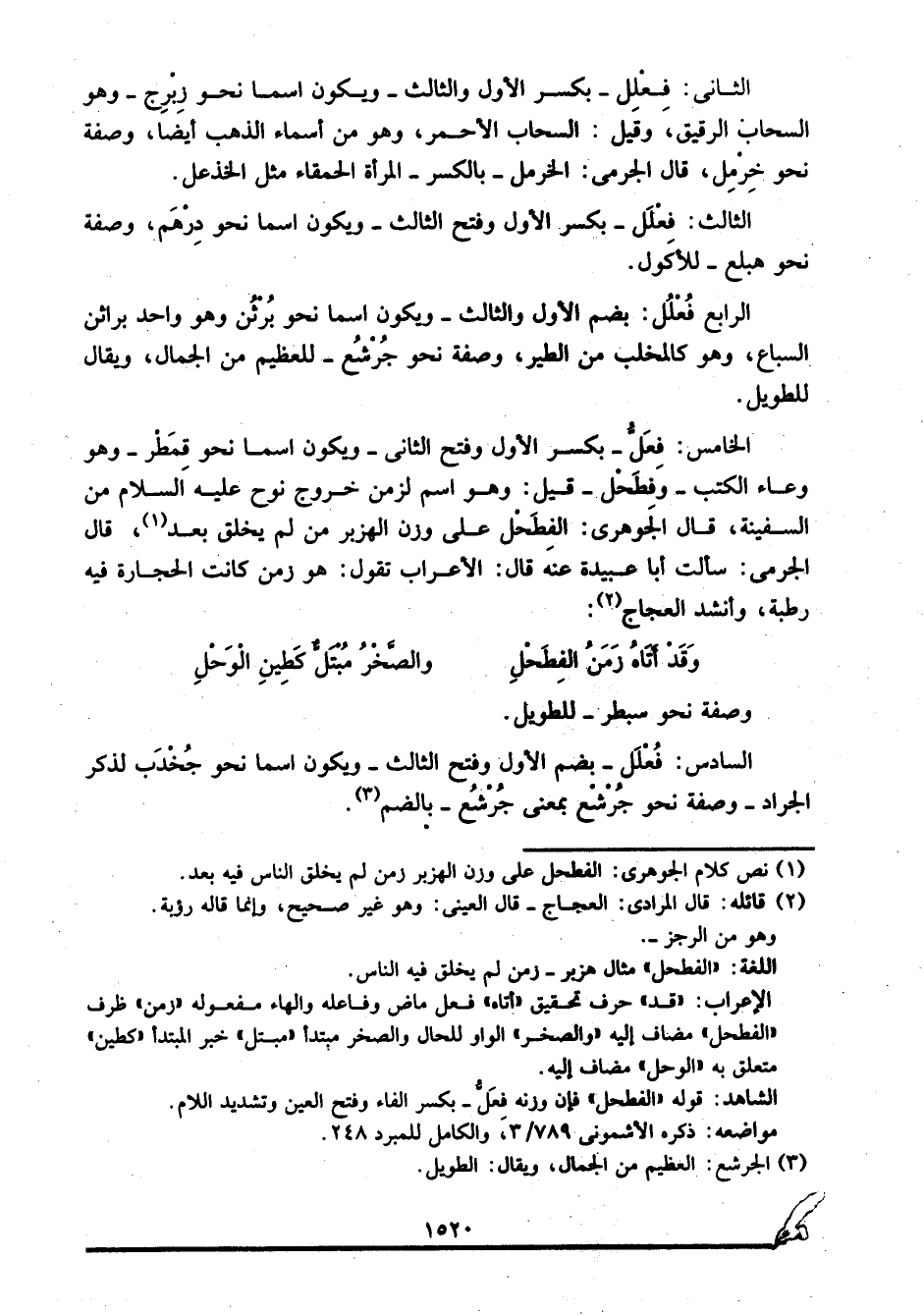 الشاهد: قوله: "الفطحل" فإن وزنه فِعَلّ -بكسر الفاء وفتح العين وتشديد اللام.
