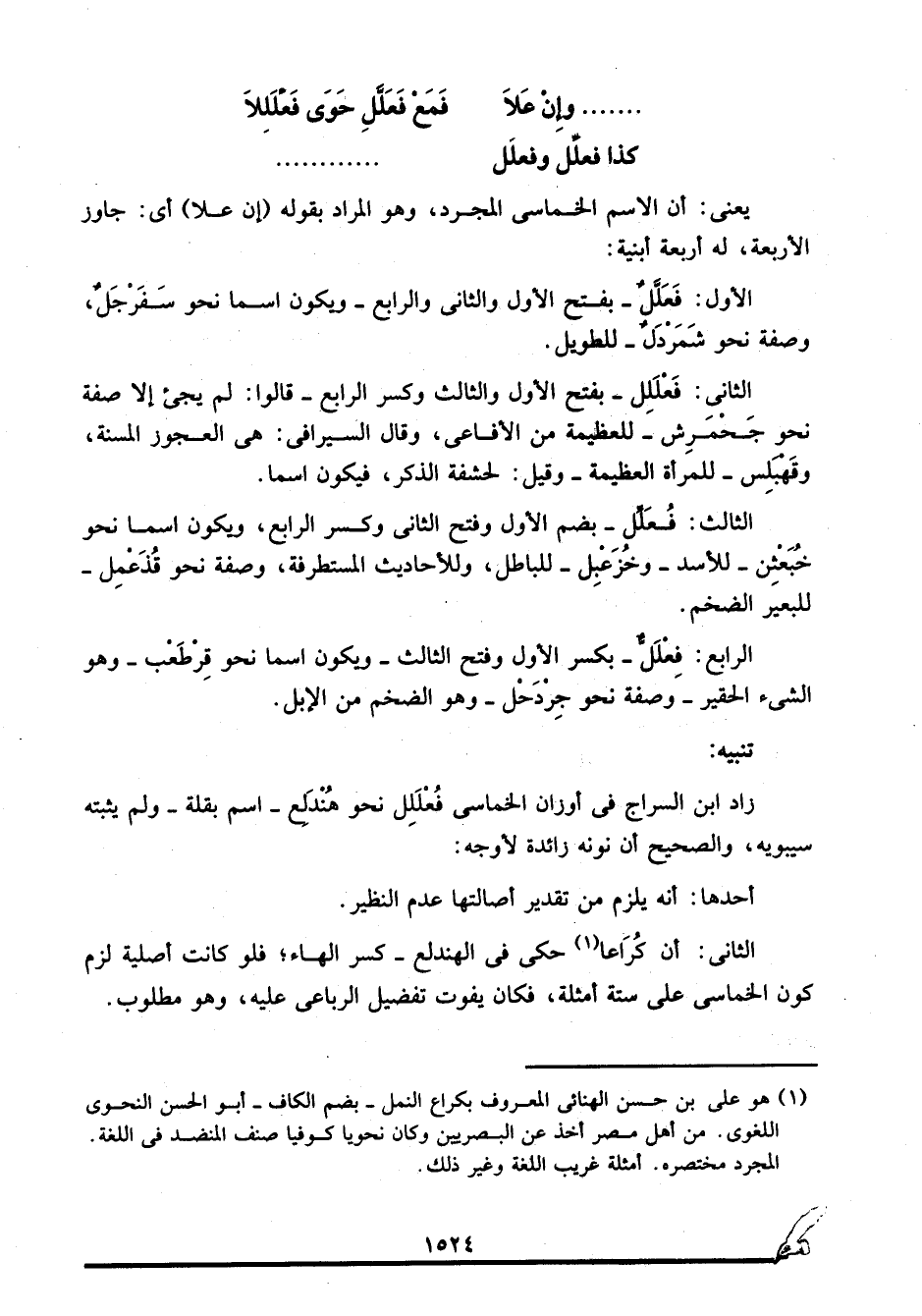 زاد ابن السراج في أوزان الخماسي فُعْلَلِل نحو هندلع -اسم بقلة- ولم يثبته سيبويه، والصحيح أن نونه زائدة لأوجه: