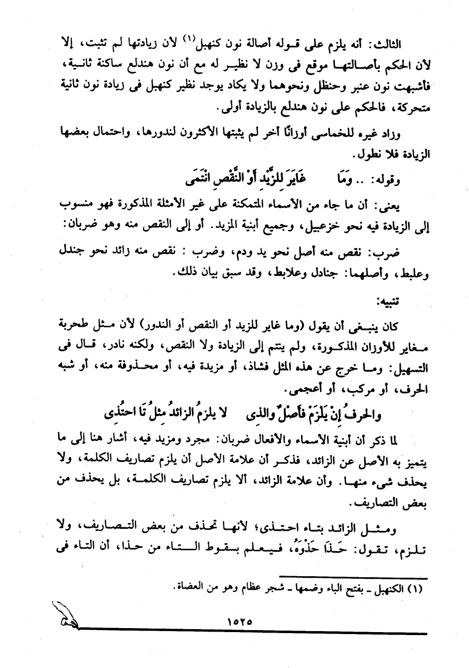 الثالث: أنه يلزم على قوله أصالة نون كنهبل1؛ لأن زيادتها لم تثبت، إلا لأن الحكم بأصالتها موقع في وزن لا نظير له مع أن نون هندلع ساكنة ثانية، فأشبهت نون عنبر وحنظل ونحوهما ولا يكاد يوجد نظير كنهبل في زيادة نون ثانية متحركة، فالحكم على نون هندلع بالزيادة أولى.