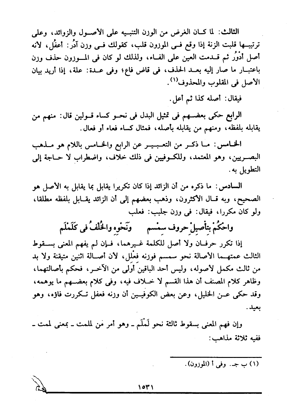 الثالث: لما كان الغرض من الوزن التنبيه على الأصول والزوائد، وعلى ترتيبها قلبت الزنة إذا وقع في الموزون قلب، كقولك في وزن آدُر: أعفُل؛ لأنه أصل أدور ثم قدمت العين على الفاء؛ ولذلك لو كان في الموزون حذف وزن باعتبار ما صار إليه بعد الحذف، في قاض: فاع؛ وفي عدة: علة، إذا أريد بيان الأصل في المقلوب والمحذوف1.