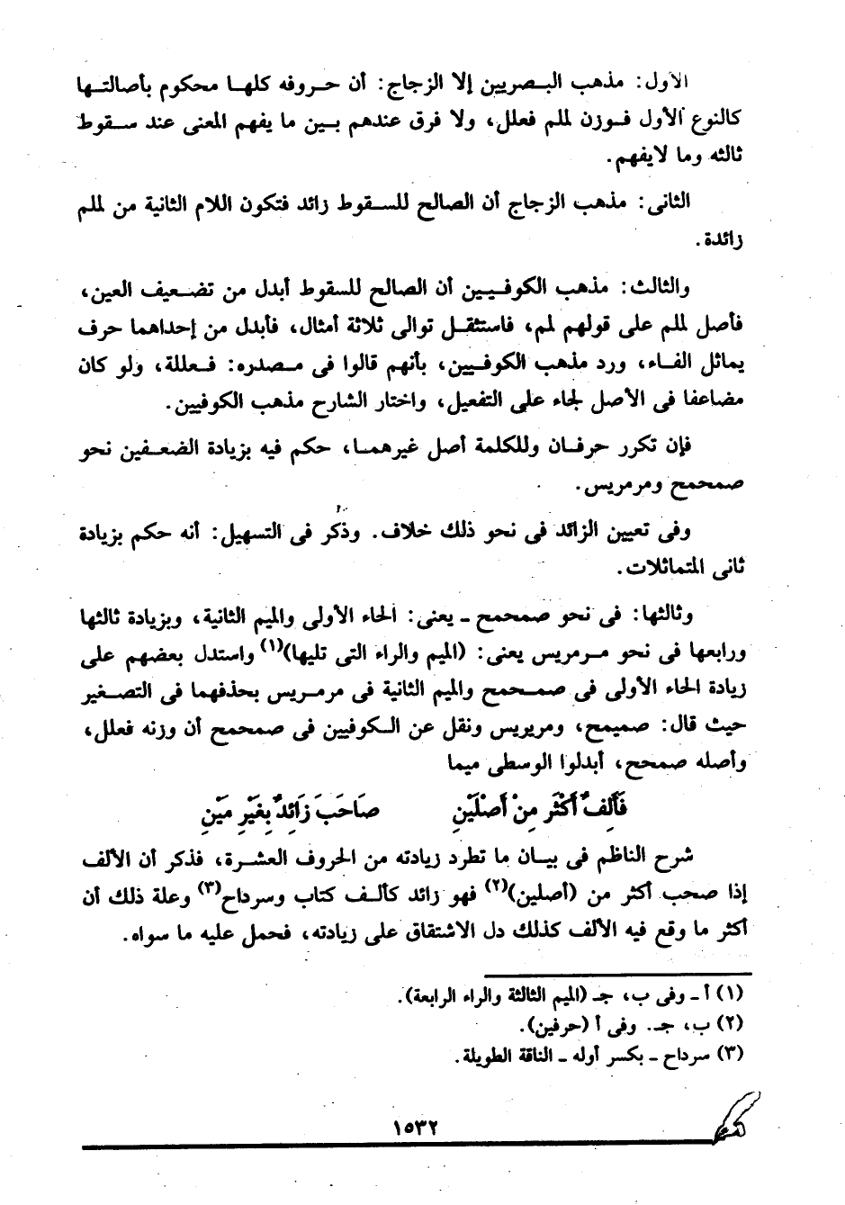 وثالثها: في نحو صمحمح -يعني: الحاء الأولى والميم الثانية- وبزيادة ثالثها ورابعها في نحو مرمريس يعني "الميم والراء التي تليها"1. واستدل بعضهم على زيادة الحاء الأولى في صمحمح والميم الثانية في مرمريس بحذفهما في التصغير حيث قال: صميمح ومريريس، ونقل عن الكوفيين في صمحمح أن وزنه فعلل، وأصله صمحح، أبدلوا الوسطى ميما.
