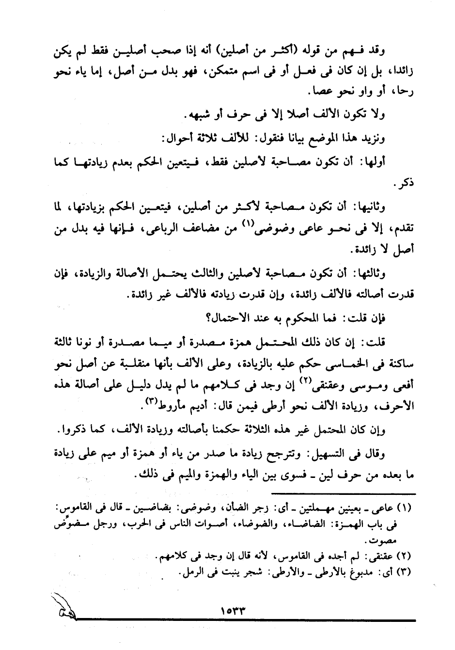 قلت: إن كان ذلك المحتمل همزة مصدرة أو ميما مصدرة أو نونا ثالثة ساكنة في الخماسي حكم عليه بالزيادة، وعلى الألف بأنها منقلبة عن أصل نحو: أفعى وموسى وعقنقى2، إن وجد في كلامهم ما لم يدل دليل على أصالة هذه الأحرف، وزيادة الألف نحو أرطى فيمن قال: أديم مأروط3.