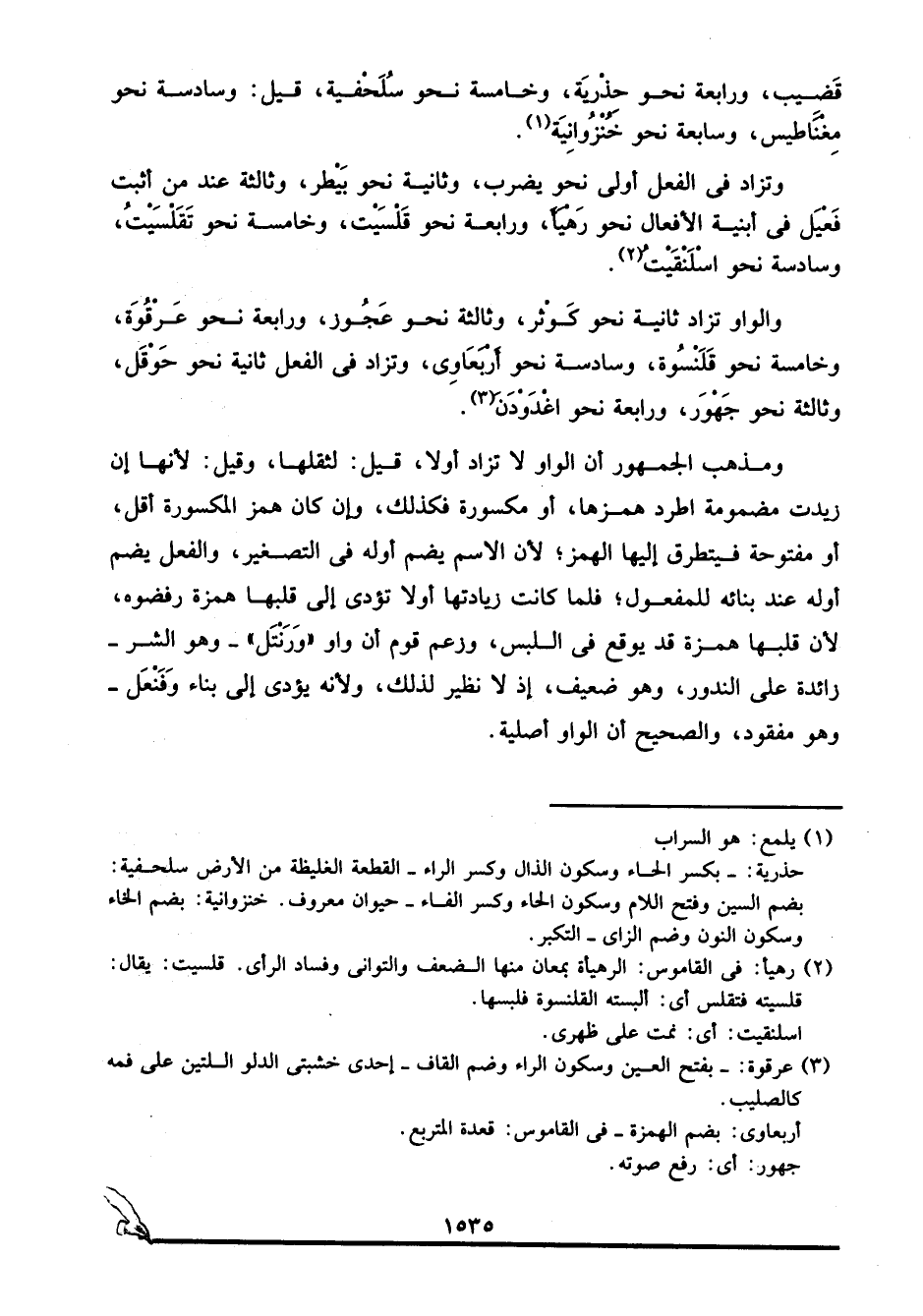 والواو تزاد ثانية نحو كوثر، وثالثة نحو عجوز، ورابعة نحو عَرْقُوة، وخامسة نحو قلنسوة، وسادسة نحو أَرْبَعَاوِي، وتزاد في الفعل ثانية نحو حوقل، وثالثة نحو جَهْوَر، ورابعة نحو اغْدَوْدَنَ3.