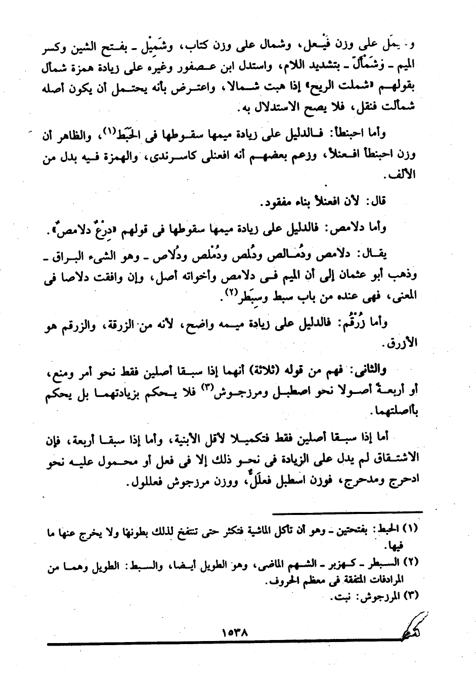 وأما احبنطأ، فالدليل على زيادة ميمها سقوطها في الْحَبَط1، والظاهر أن وزن احبنطأ افعنلأ، وزعم بعضهم أنه افعنلى كاسرندى، والهمزة فيه بدل من الألف.
