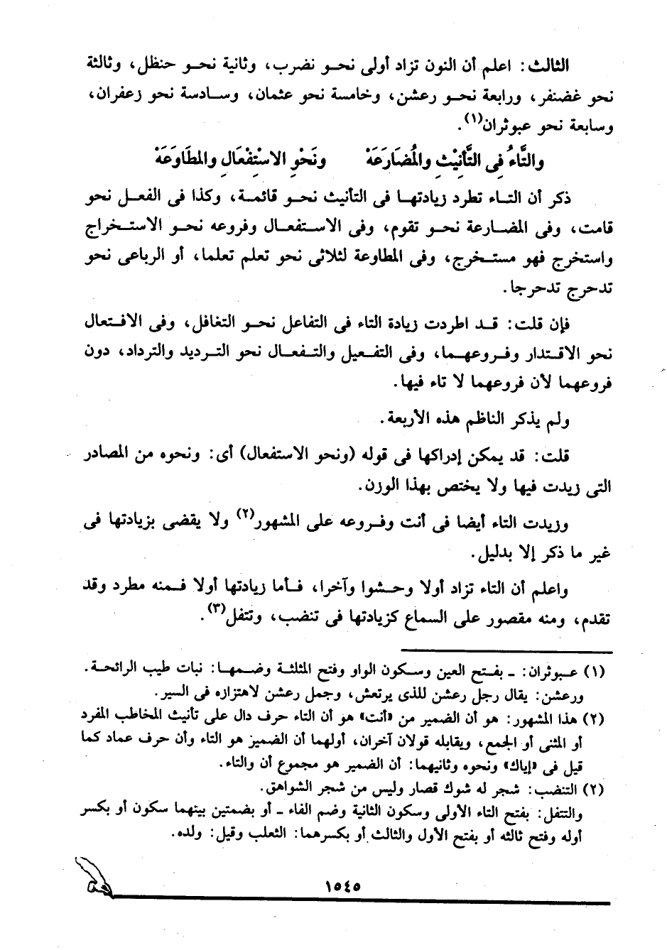 الثالث: اعلم أن النون تزاد أولى نحو نضرب، وثانية نحو حنظل، وثالثة نحو غضنفر، ورابعة نحو رعشن، وخامسة نحو عثمان، وسادسة نحو زعفران، وسابعة نحو عبوثران1.