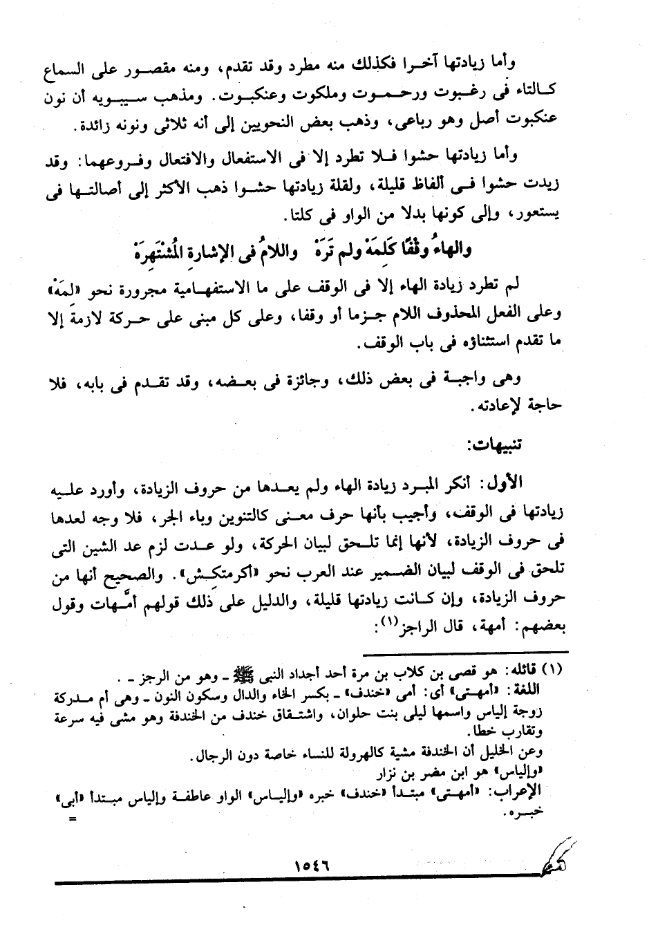 الأول: أنكر المبرد زيادة الهاء ولم يعدها من حروف الزيادة، وأورد عليه زيادتها في الوقف، وأجيب بأنها حرف معنى كالتنوين وباء الجر، فلا وجه لعدها في حروف الزيادة؛ لأنها إنما تلحق لبيان الحركة، ولو عدت لزم عد الشين التي تلحق في الوقف لبيان الضمير عند العرب نحو "أكرمتكِش". والصحيح أنها من حروف الزيادة، وإن كانت زيادتها قليلة، والدليل على ذلك قولهم: أمَّهات، وقول بعضهم: أمهة، قال الراجز1: