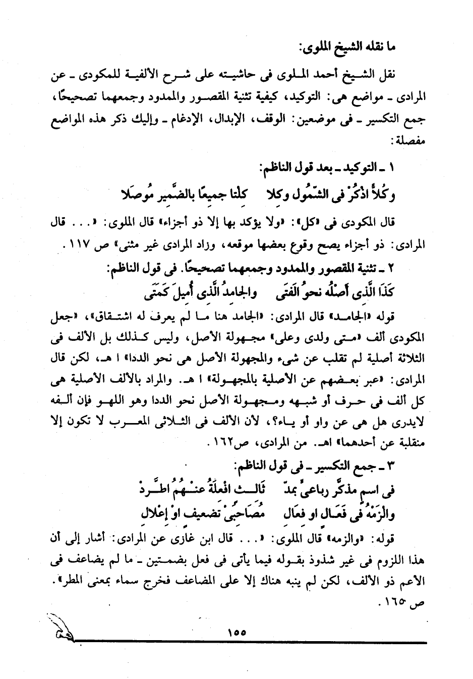 قوله: "والزمه" قال الملوي: " ... قال ابن غازي عن المرادي: أشار إلى أن هذا الملزوم في غير شذوذ بقوله فيما يأتي في فعل بضمتين- ما لم يضاعف في الأعم ذو الألف، لكن لم ينبه هناك إلا على المضاعف فخرج سماء بمعنى المطر".