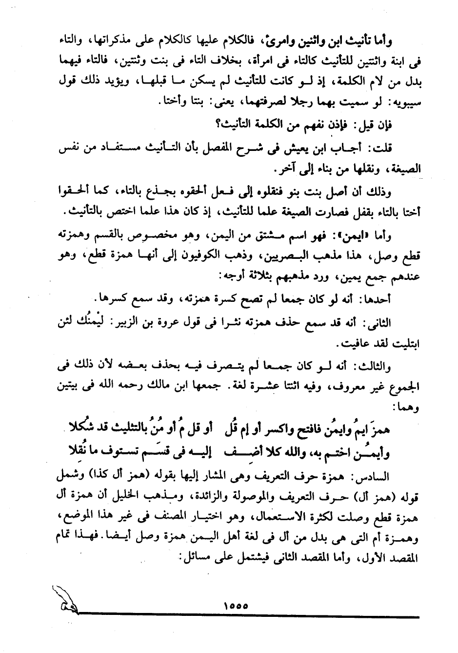 وأما تأنيث ابن واثنين وامرئ، فالكلام عليها كالكلام على مذكراتها، والتاء في ابنة واثنتين للتأنيث كالتاء في امرأة، بخلاف التاء في بنت وثنتين، فالتاء فيهما بدل من لام الكلمة؛ إذ لو كانت للتأنيث لم يسكن ما قبلها، ويؤيد ذلك قول سيبويه: لو سميت بهما رجلا لصرفتهما، يعني: بنتا وأختا.