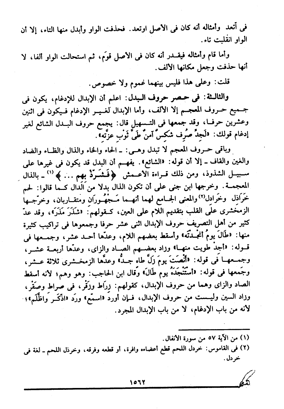 وباقي حروف المعجم لا تبدل وهي: الحاء والخاء والذال والظاء والضاد والغين والقاف، إلا أن قوله: "الشائع" يفهم أن البدل قد يكون في غيرها على سبيل الشذوذ، ومن ذلك قراءة الأعمش: "فَشَرِّذْ بِهِمْ"1 بالذال المعجمة. وخرجها ابن جني على أن تكون الذال بدلا من الدال كما قالوا: لحم خَرَاذِل وخَرَادِل2، والمعنى الجامع لهما أنهما مَجْهُوَران ومتقاربان، وخرجها الزمخشري على القلب بتقديم اللام على العين، كقولهم: "شَذَرَ مَذَرَ"، وقد عد كثير من أهل التصريف حروف الإبدال اثني عشر حرفا وجمعوها في تراكيب كثيرة منها: "طال يوم أنجدته" وأسقط بعضهم اللام، وعدها أحد عشر، وجمعها في قوله: "أجد طويت منها" وزاد بعضهم الصاد والزاي، وعدها أربعة عشر، وجمعها في قوله: "أنصت يوم زل طاه جد" وعدها الزمخشري ثلاثة عشر، وجمعها في قوله: "استنجده يوم طال" وقال ابن الحاجب: وهو وهم؛ لأنه أسقط الصاد والزاي وهما من حروف الإبدال، كقولهم: زِرَاط وزَقْر، في صراط وصقر، وزاد السين وليست من حروف الإبدال، فإن أورد "اسمع" ورد "اذّكر واظّلم"؛ لأنه من باب الإدغام، لا من باب الإبدال المجرد.