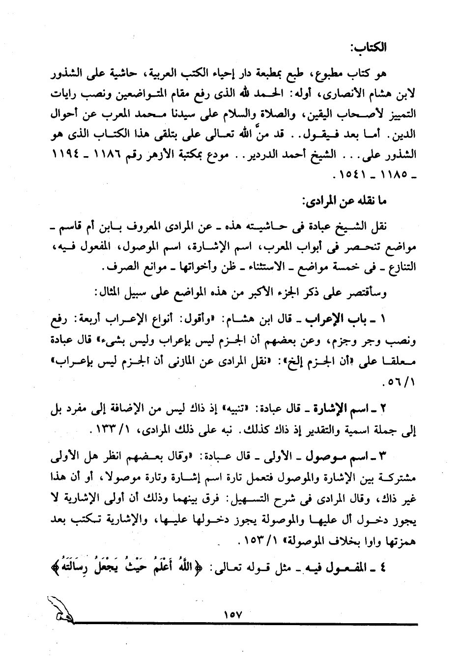 هو كتاب مطبوع، طبع بمطبعة دار إحياء الكتب العربية، حاشية على الشذور لابن هشام الأنصاري، أوله: الحمد لله الذي رفع مقام المتواضعين ونصب رايات التمييز لأصحاب اليقين، والصلاة والسلام على سيدنا محمد المعرب عن أحوال الدين. أما بعد فيقول ... قد من الله تعالى عليّ بتلقي هذا الكتاب الذي هو الشذور على ... الشيخ أحمد الدردير. مودع بمكتبة الأزهر رقم 1186-1194-1185-1541.
